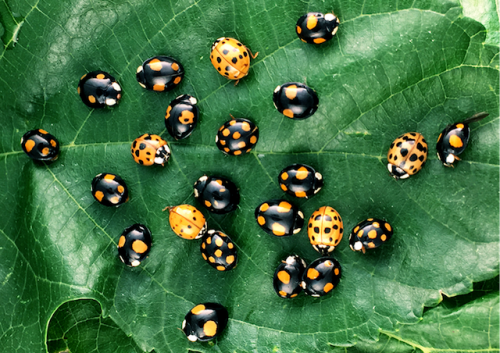 Wie wir bereits erwähnt haben, denkt man landläufig, dass Marienkäfer runde, rotflügelige Insekten mit schwarzen Punkten sind. Wir haben aber auch erwähnt, dass es viele Arten von Marienkäfern gibt:in den Farben orange und gelb und mit verschiedenen Punktmustern. Die Punkte sind in der Regel schwarz.